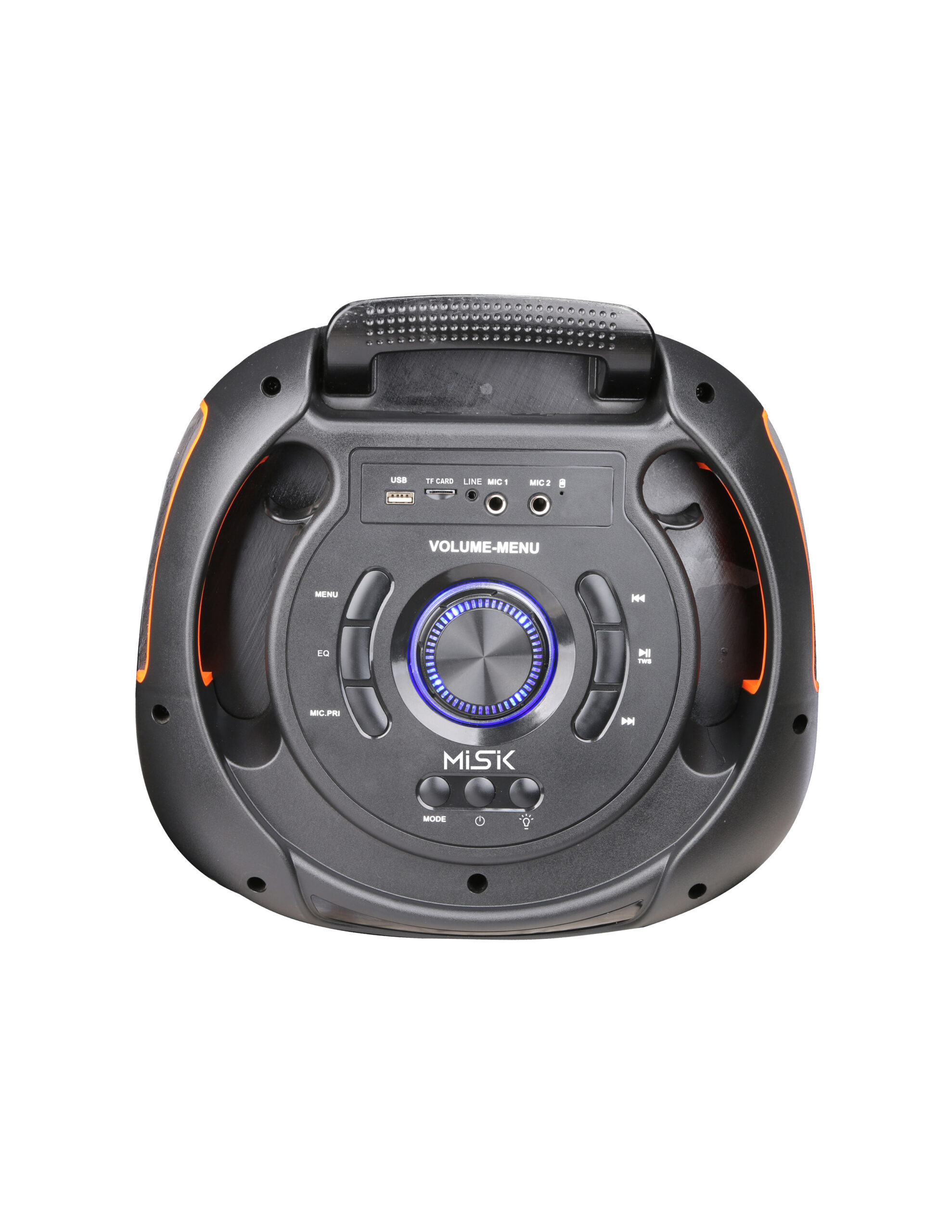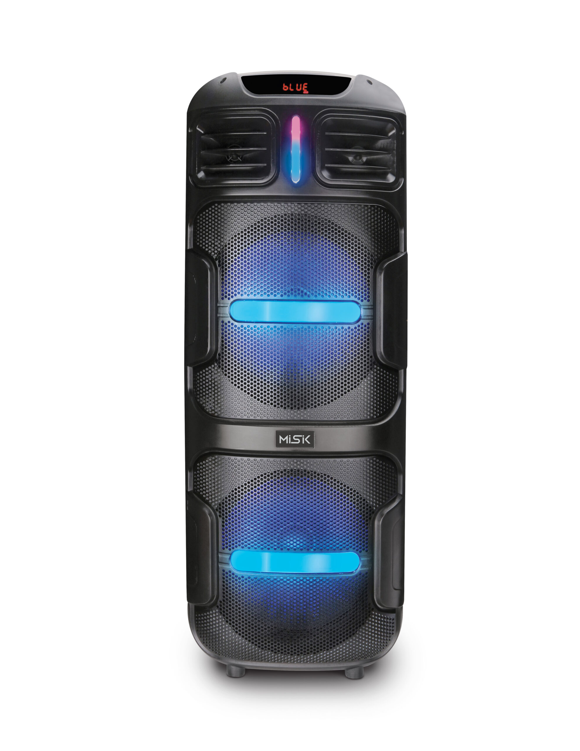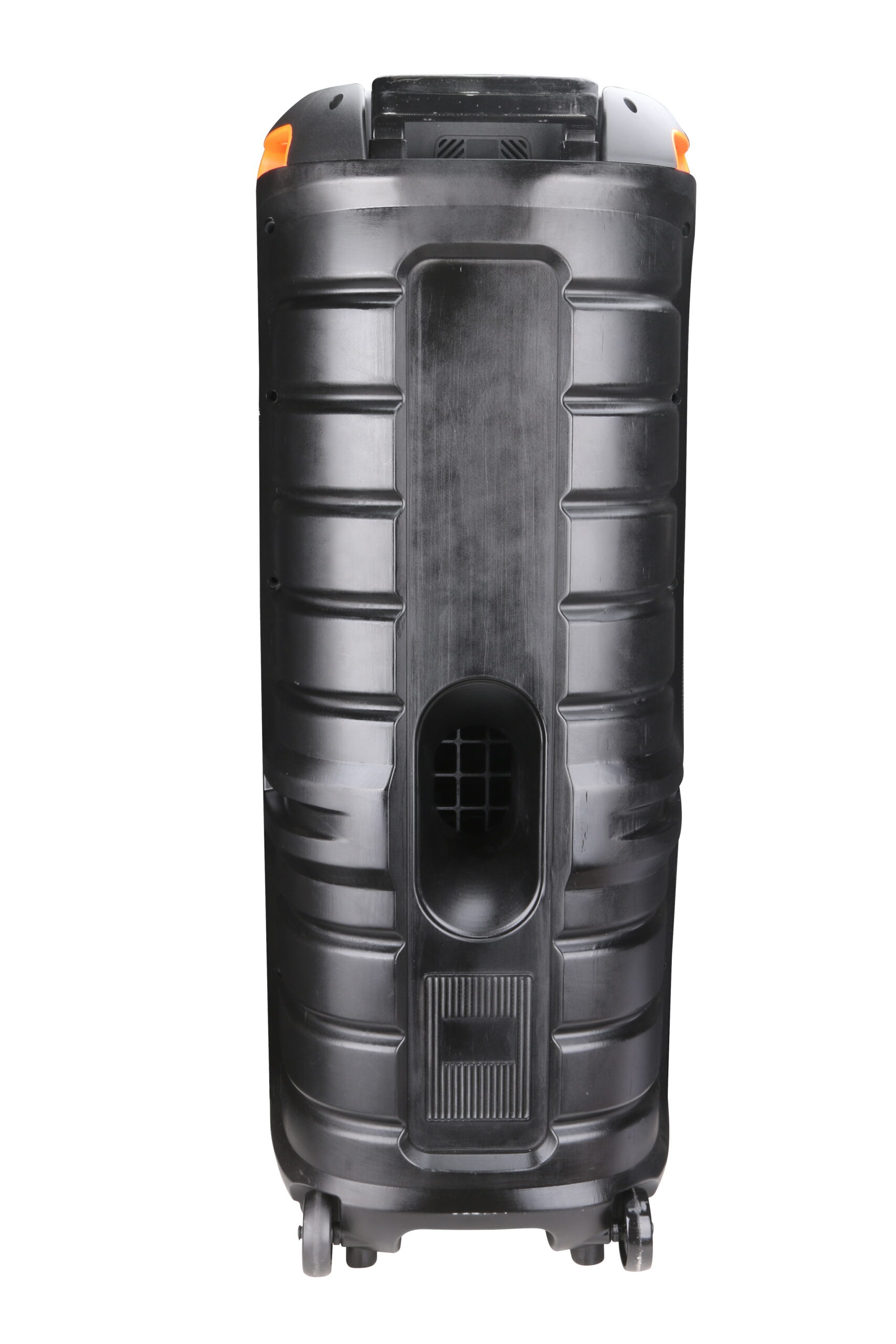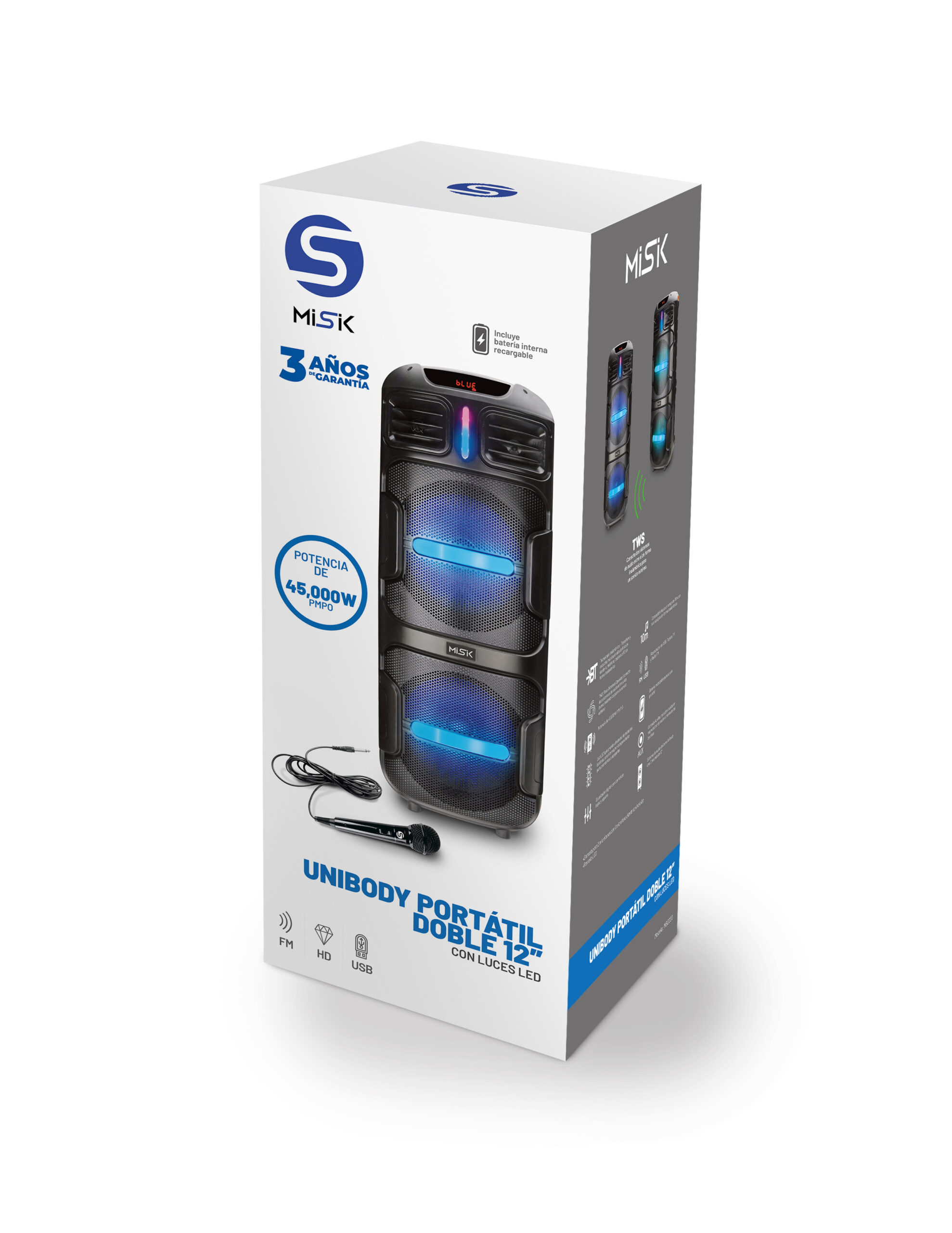 Bocina Unibody Portátil TWS Doble 12” con luz LED Flame. Potencia extrema con doble bocina de 12”, con efecto LED Flame que enciende el ambiente y conexión TWS para un sonido más envolvente.